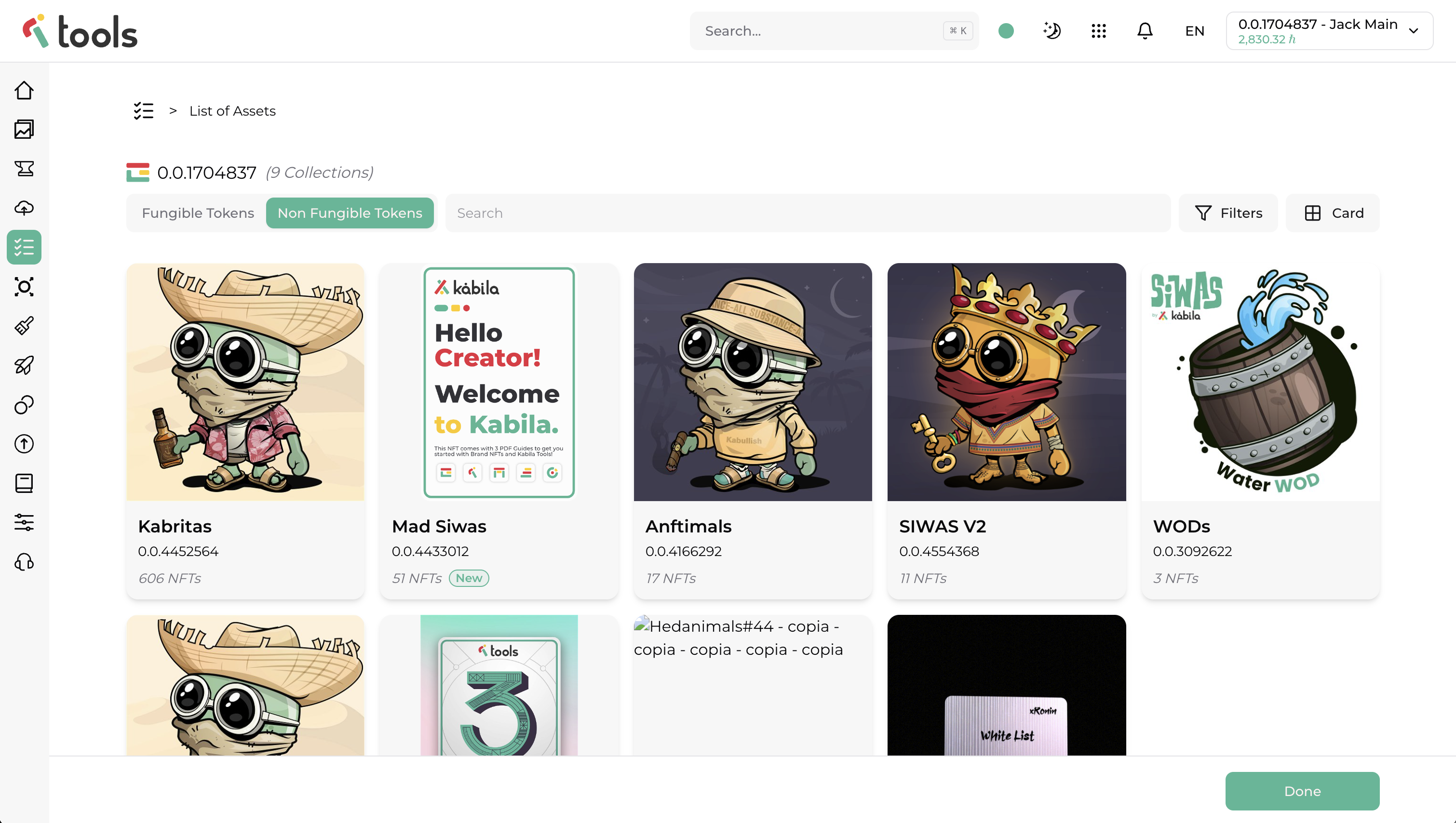 <figure><picture><source srcset="https://3645248977-files.gitbook.io/~/files/v0/b/gitbook-x-prod.appspot.com/o/spaces%2FlgJRCweEJgIAci2zeZ82%2Fuploads%2FK3YyUmdu33YPRemFvMsE%2FKabila%20Tools%20View%20List%20of%20Assets%20Dark.png?alt=media&#x26;token=3338315f-9a6d-4579-8149-898d080657fa" media="(prefers-color-scheme: dark)"><img src="https://3645248977-files.gitbook.io/~/files/v0/b/gitbook-x-prod.appspot.com/o/spaces%2FlgJRCweEJgIAci2zeZ82%2Fuploads%2FArRp9WqQ2b2bH1oSft2N%2FKabila%20Tools%20View%20List%20of%20Assets.png?alt=media&#x26;token=9ffd618d-9d55-41c8-aba9-dbb0a3da453b" alt=""></picture><figcaption><p>NFTs held by Account <strong>0.0.1704837</strong></p></figcaption></figure>